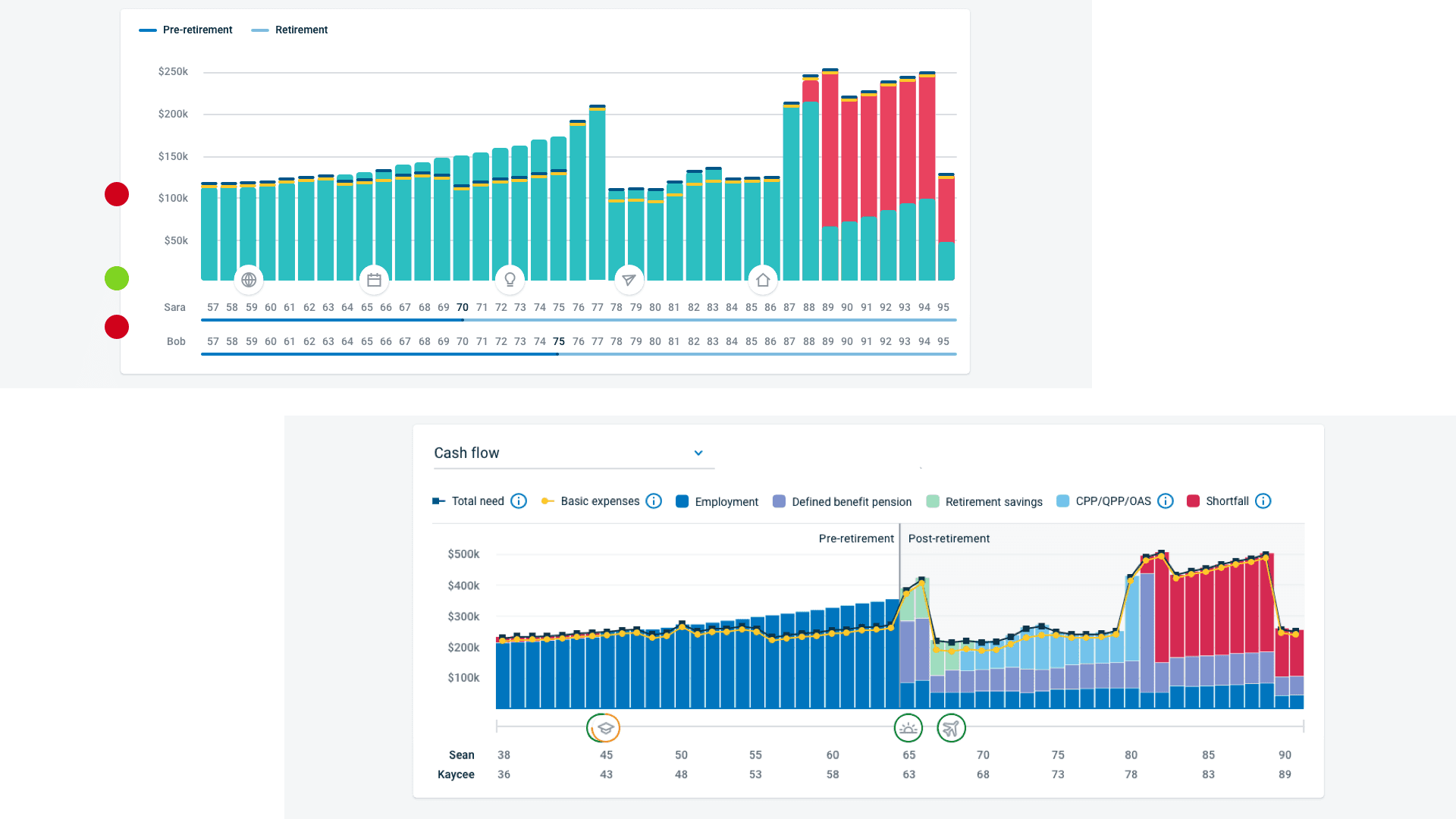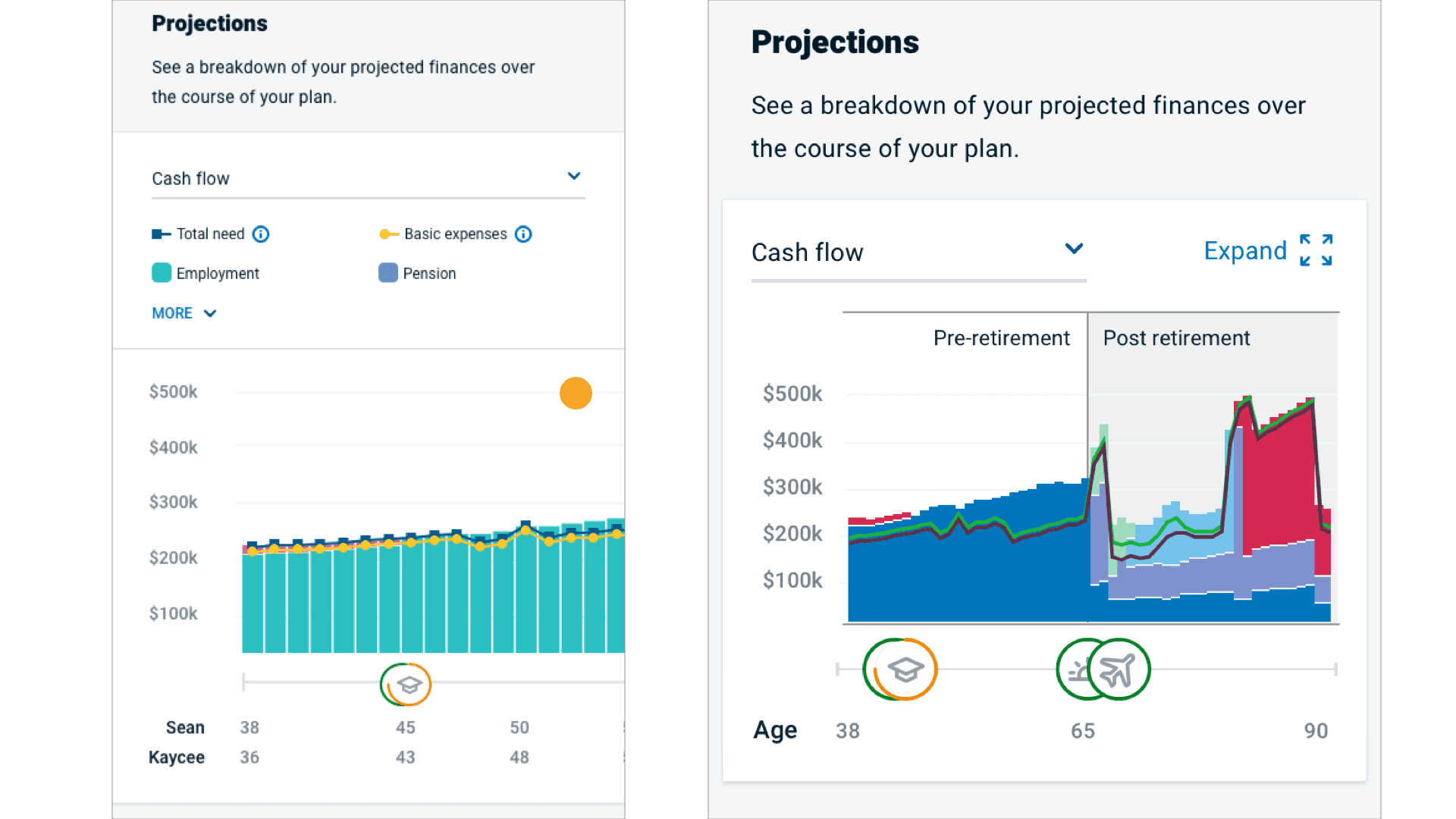 A detailed financial chart was required for clients who want to dig deeper into their financial picture. One feedback for the first iteration was that the design did not provide enough details for users to read the chart. The other feedback was that the age timeline being too overwhelming with lots of numbers. In the final iteration, I added legends and tooltips and simplified the age timeline. One positive feedback was that users like the goals embedded with the financial chart which I kept for the final version.