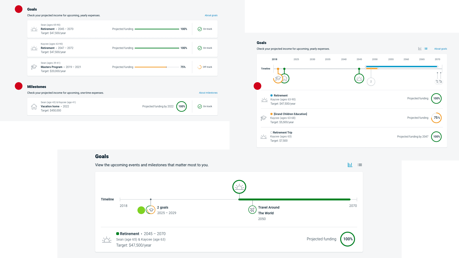 Setting up financial goals is the most important step in the planning process. In the first iteration, our first testing had shown that the user didn't understand the differences between single-year and multi-year goals. In the second iteration, these two types of goals are combined. And I choose to show a full list of goals with a timeline to show how a client's goals occur during their lifetime. After testing with financial advisors, I learned that for joint plans, it usually starts with 6 goals at least. In this scenario, a full list will take up space on the page hence push other information to a lower point. This is not ideal for a dashboard experience so I decided to show a goal timeline only. In the final iteration, the user can choose to interact with goal icons to view more details. Or they can switch to a list view to see all goals. In the testing, all users said goal pins are the first thing they would interact with.